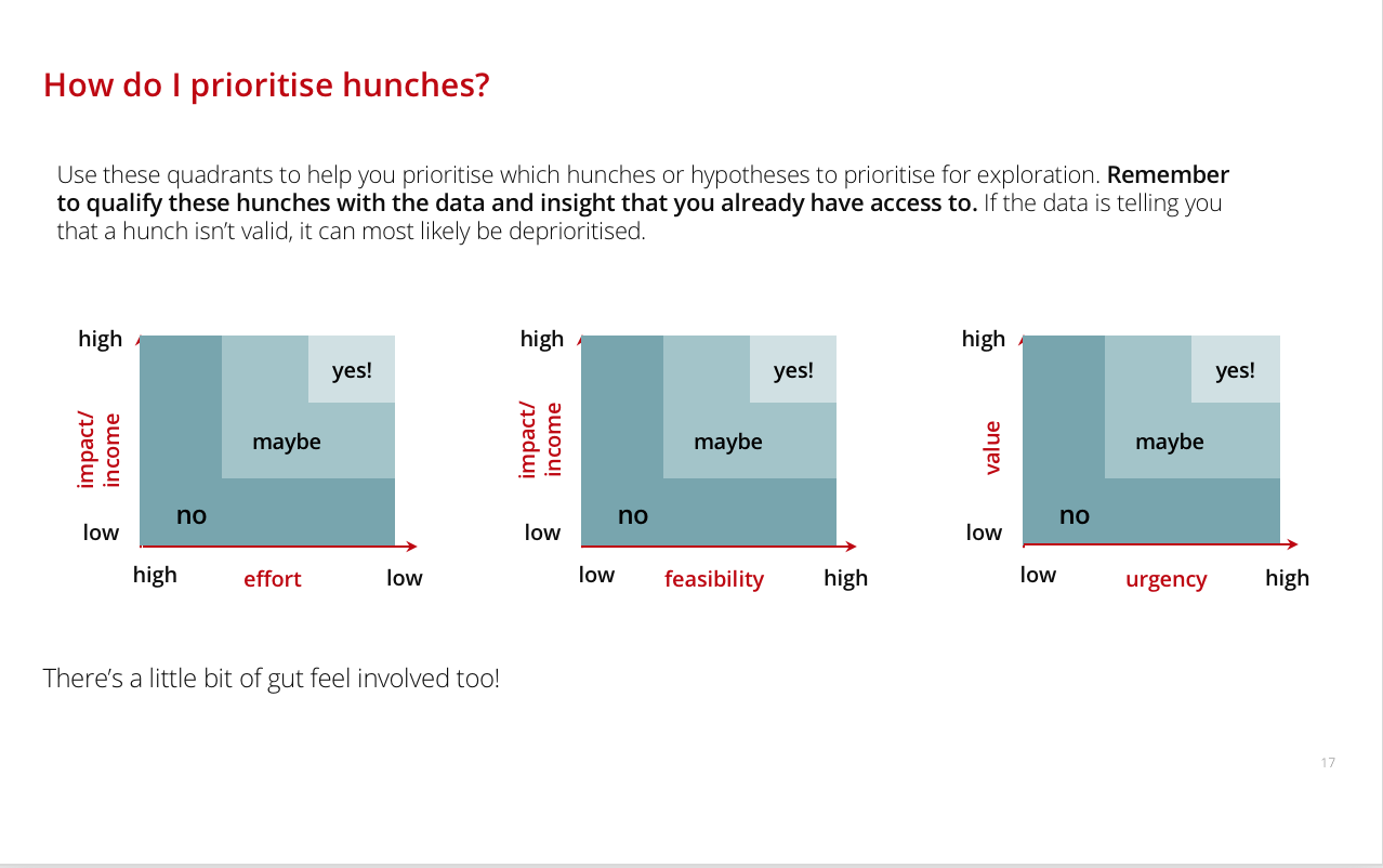 Use these quadrants to help you prioritise which hunches or hypotheses to prioritise for exploration.