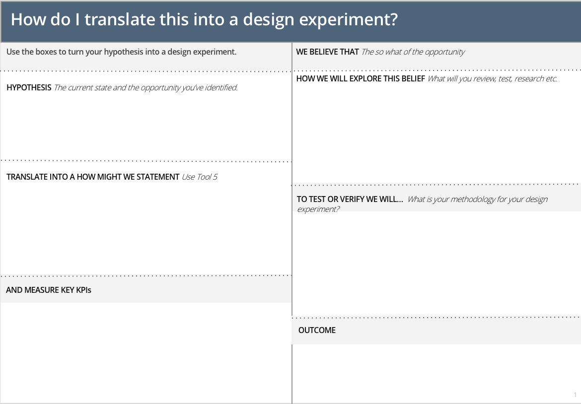 Once you have prioritised hunches you will need to translate this into a HMW question and a design experiment where you consider the objective, success criteria, methodology and outcome you’re looking for. This will help you think about the scope of your optimisation cycle.