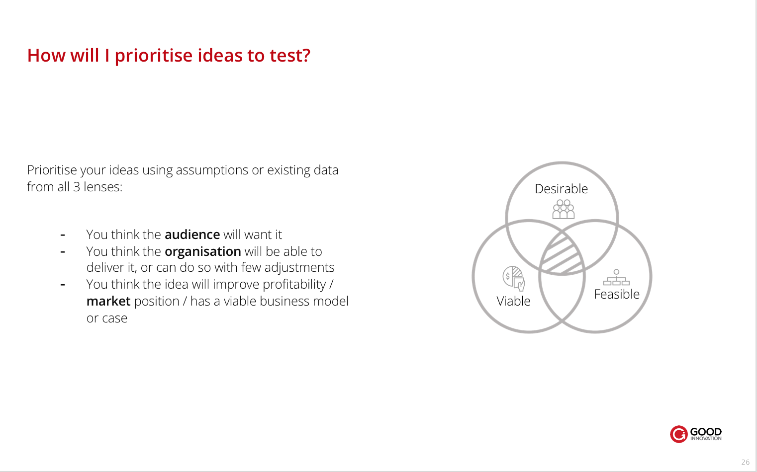 Now you need to get from your long list of ideas and prioritise them. This is where you consider your 3 lenses of insight again: audience, market, organisation.